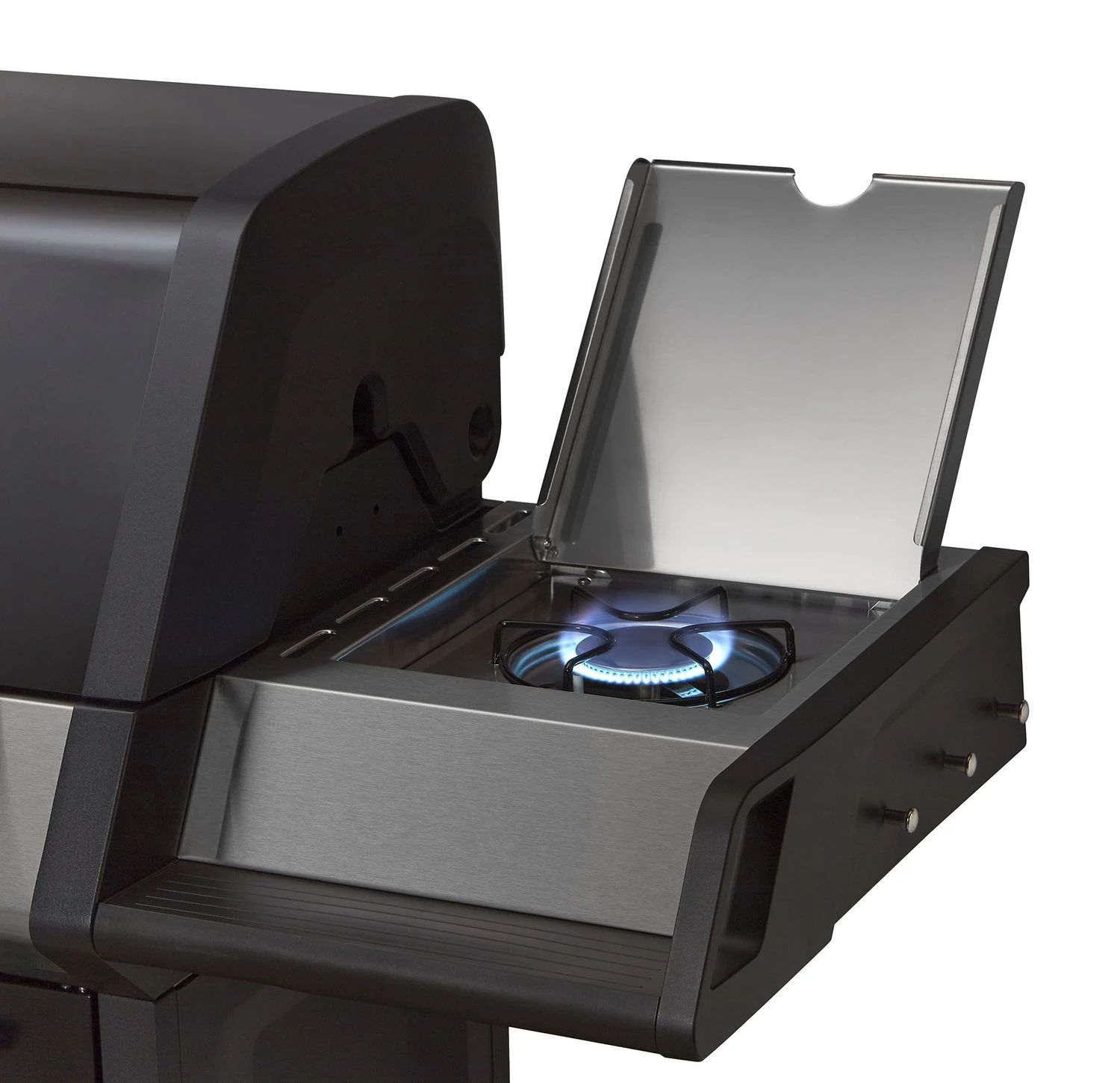 Vervollständigt werden die Vielfältigen Zubereitungsmöglichkeiten mit einem praktischen Seitenkocher und einem Edelstahl-Infrarot-Heckbrenner. Der klassische Seitenkocher mit Ringbrenner bietet die Möglichkeit Beilagen, Saucen, Suppen, Eintöpfe oder Pfannengerichte komfortabel zuzubereiten, ohne dabei die Grillfläche in Anspruch nehmen zu müssen.