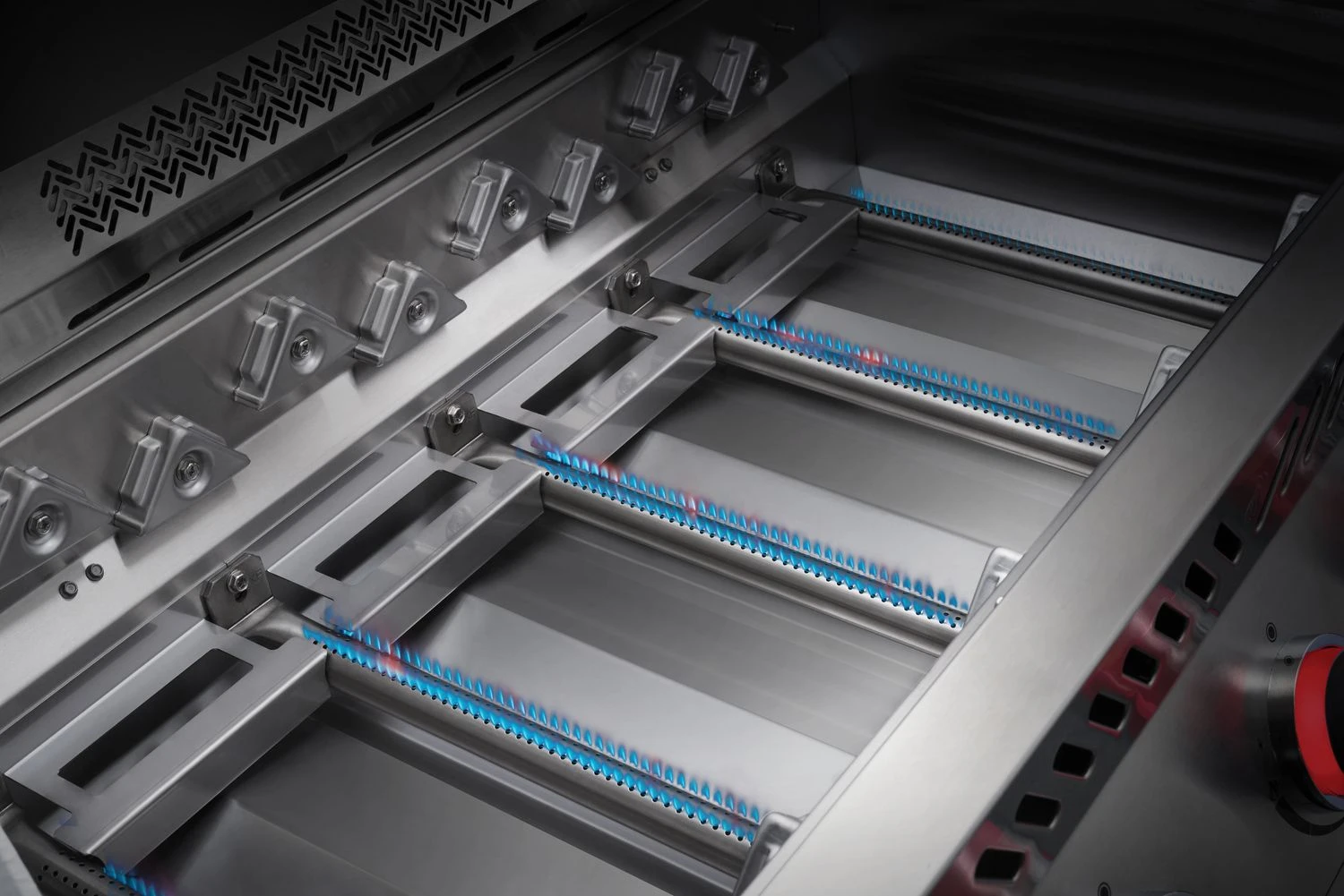 Die Edelstahl Flammenverteiler unterhalb der Grillroste sind zweistufig angeordnet. Das bedeutet, dass nicht nur direkt über jedem Brenner ein Flammenschutzblech sitzt, sondern auch dazwischen in den Zwischenräumen. Zudem sind die zusätzlichen Flammenverteiler von hinten nach vorne aufsteigend positioniert. Dadurch werden sogenannte Hotspots auf der Grillfläche verhindert. Die Hitze wird durch die Flammenschutzbleche gleichmäßig auf der gesamten Grillfläche verteilt.