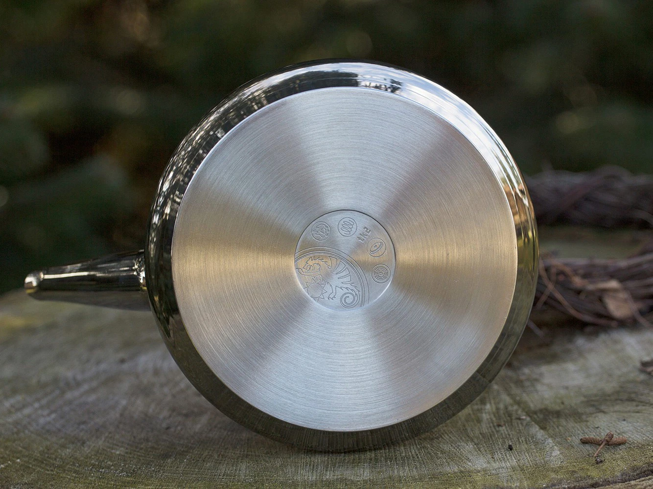 Eine angenehme und sichere Handhabung ermöglicht der dreifach gebogene, austarierte Henkel, mit dessen Hilfe sich der Kessel auch problemlos über einer Feuerstelle aufhängen und zum Transport am Rucksack befestigen lässt.